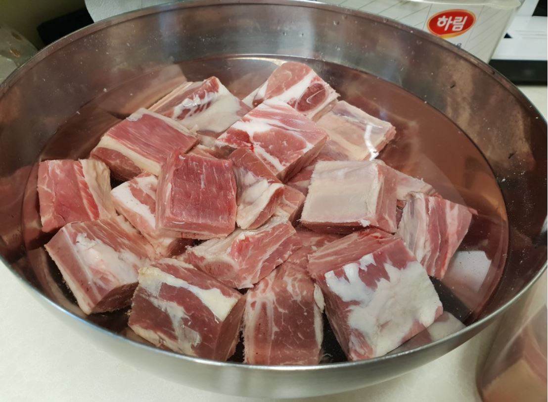 1. 찜용 LA갈비 2kg을 깨끗이 씻어 한 번 헹군 후 찬물에 20분간 핏물을 뺍니다.